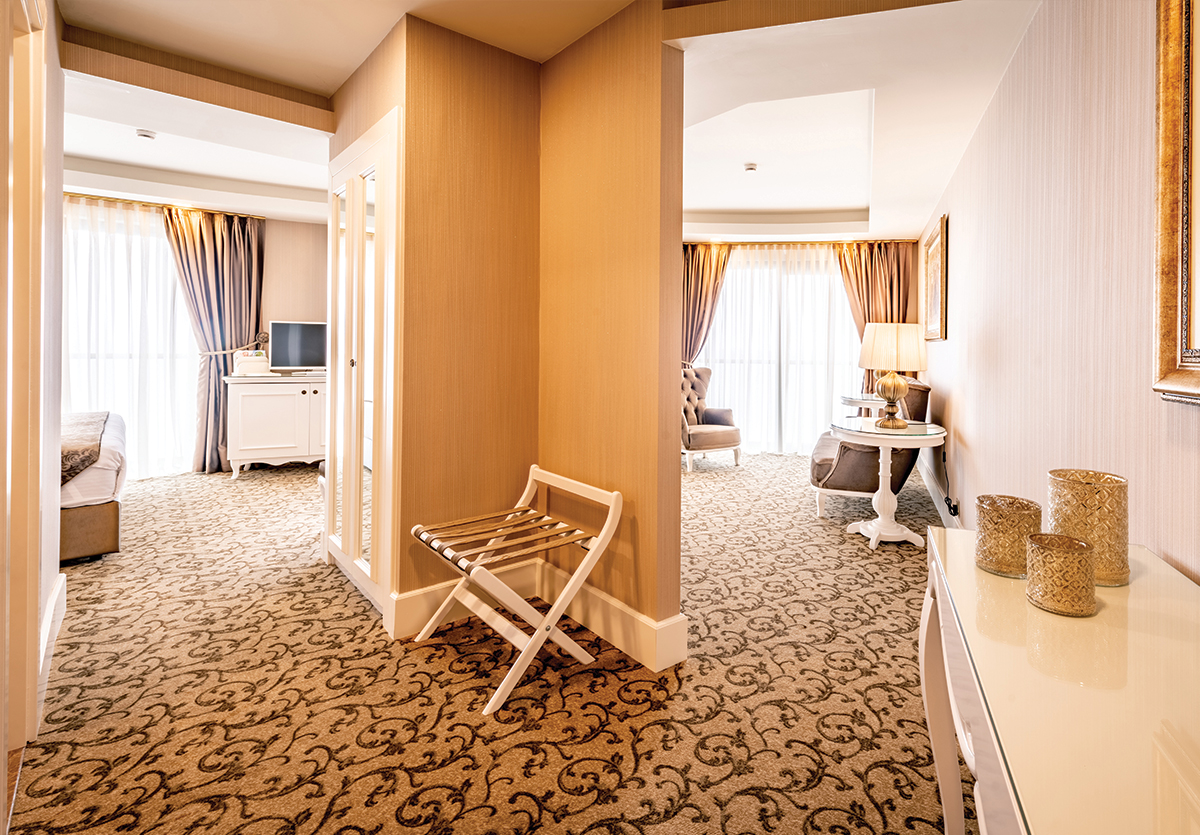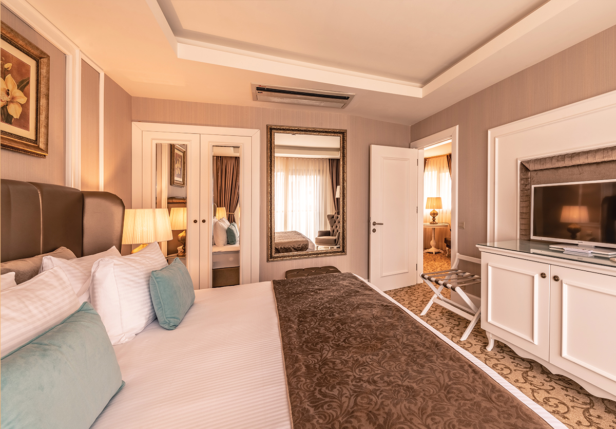 Premium Süit odalarımız 45m² toplam kullanim hacmine sahip, muhtesem manzaraya ve dekorasyona sahip süit odalarimizda bir adet king size yatak, is seyahatlerine özel çalisma masasi ve oturma grubu bulunmaktadir.