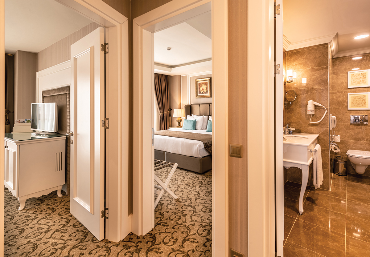 Premium King Süit odalarimiz 50m² toplam kullanim hacmine sahip, içeresinde 2 yatak odasi bir oturma odasi ve bir banyo bulunmaktadir. Oda içeresinde 2 tek kisilik yatak ve 1 king size yatak bulunmakta, ayrica banyoda dus ve küvet seçenegi sunulmaktadır.
